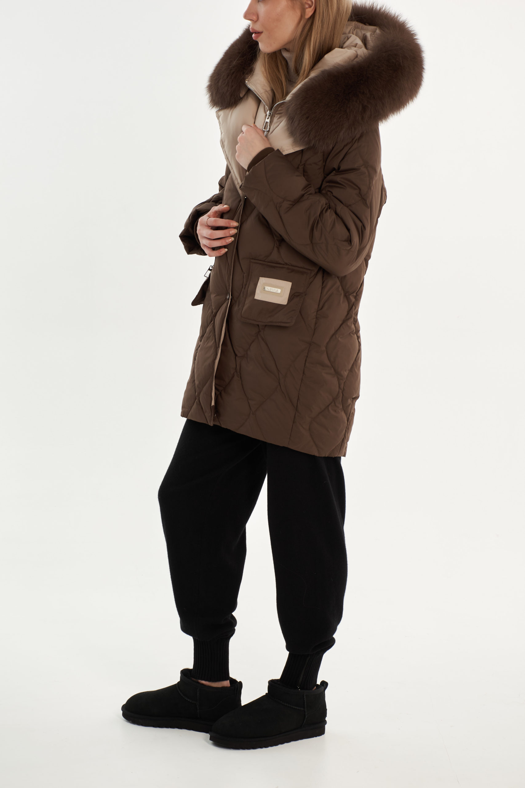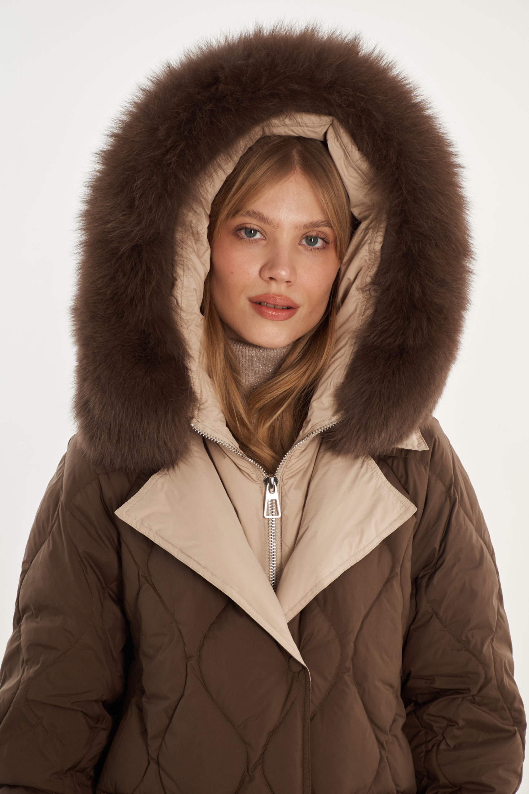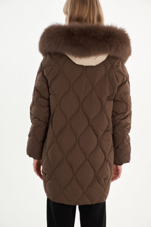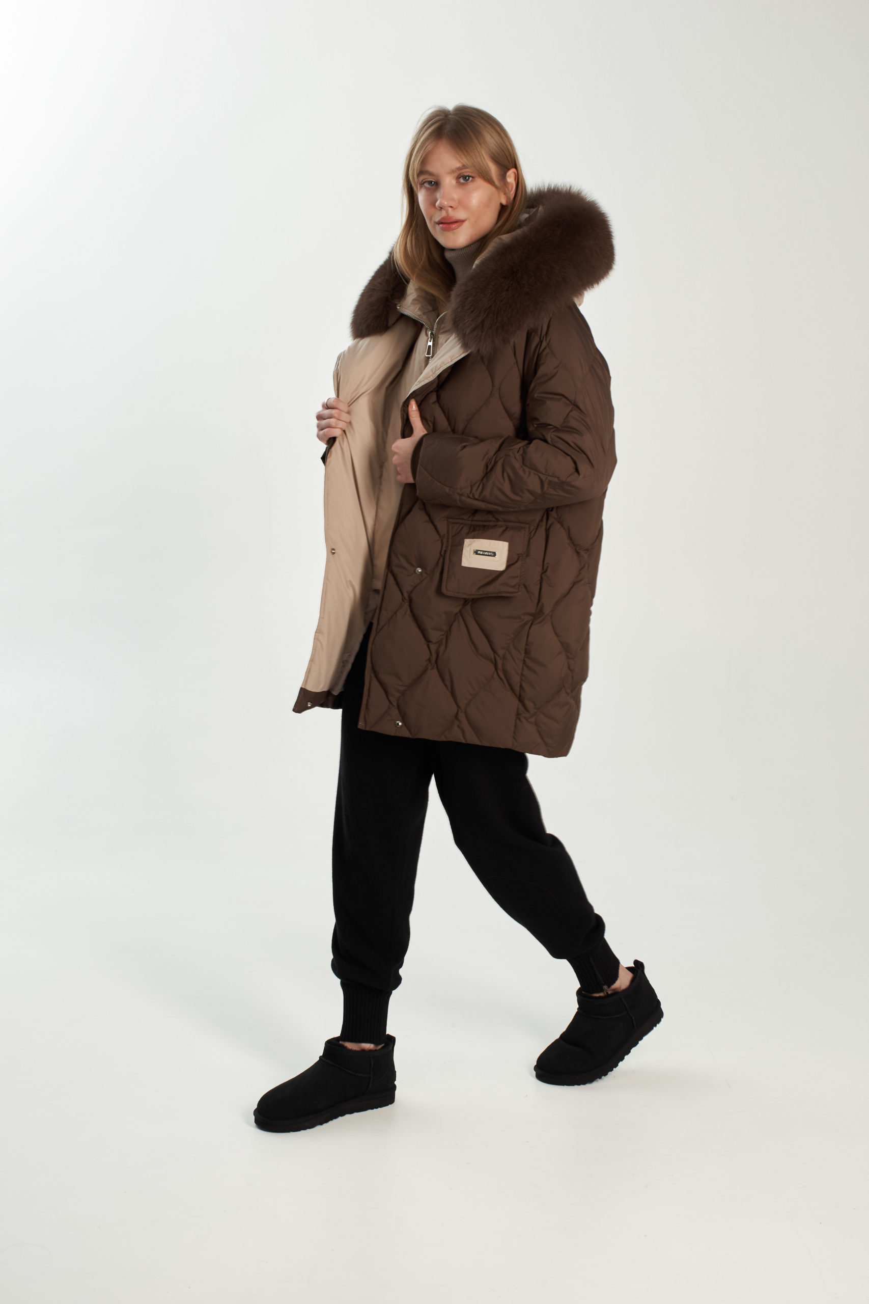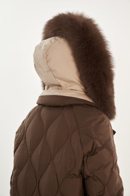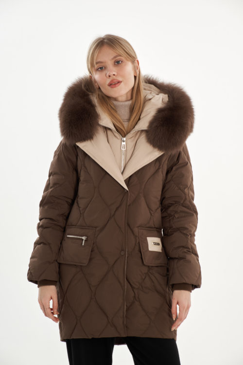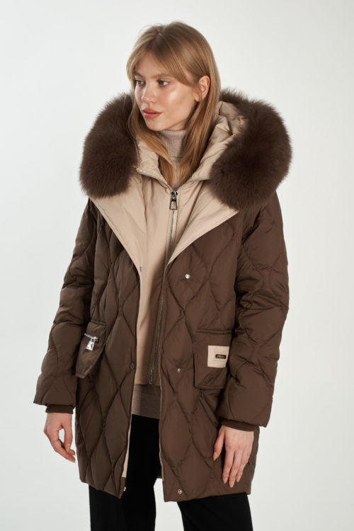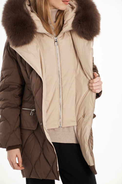 На отделке мех из песца (отстегивается), внутри имитация жилета (не отстегивается)