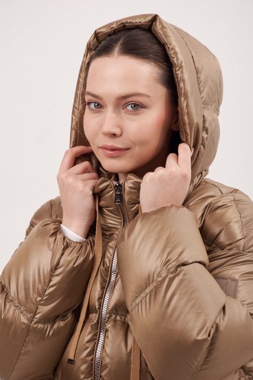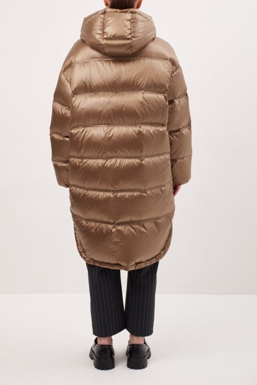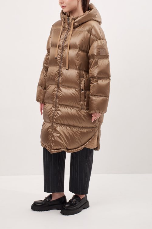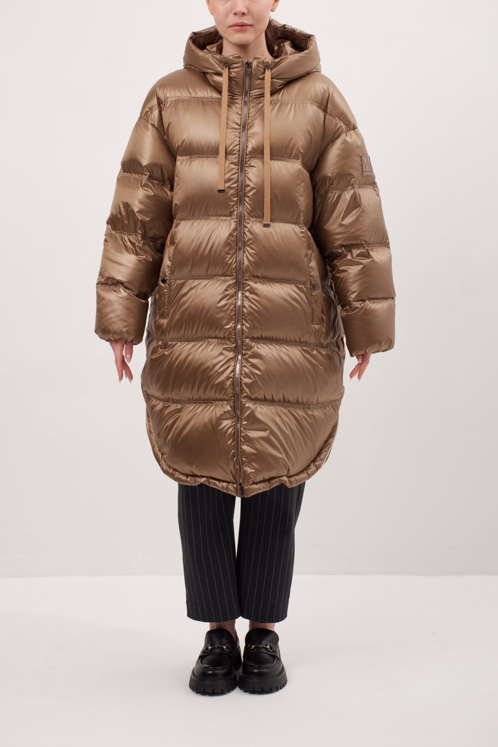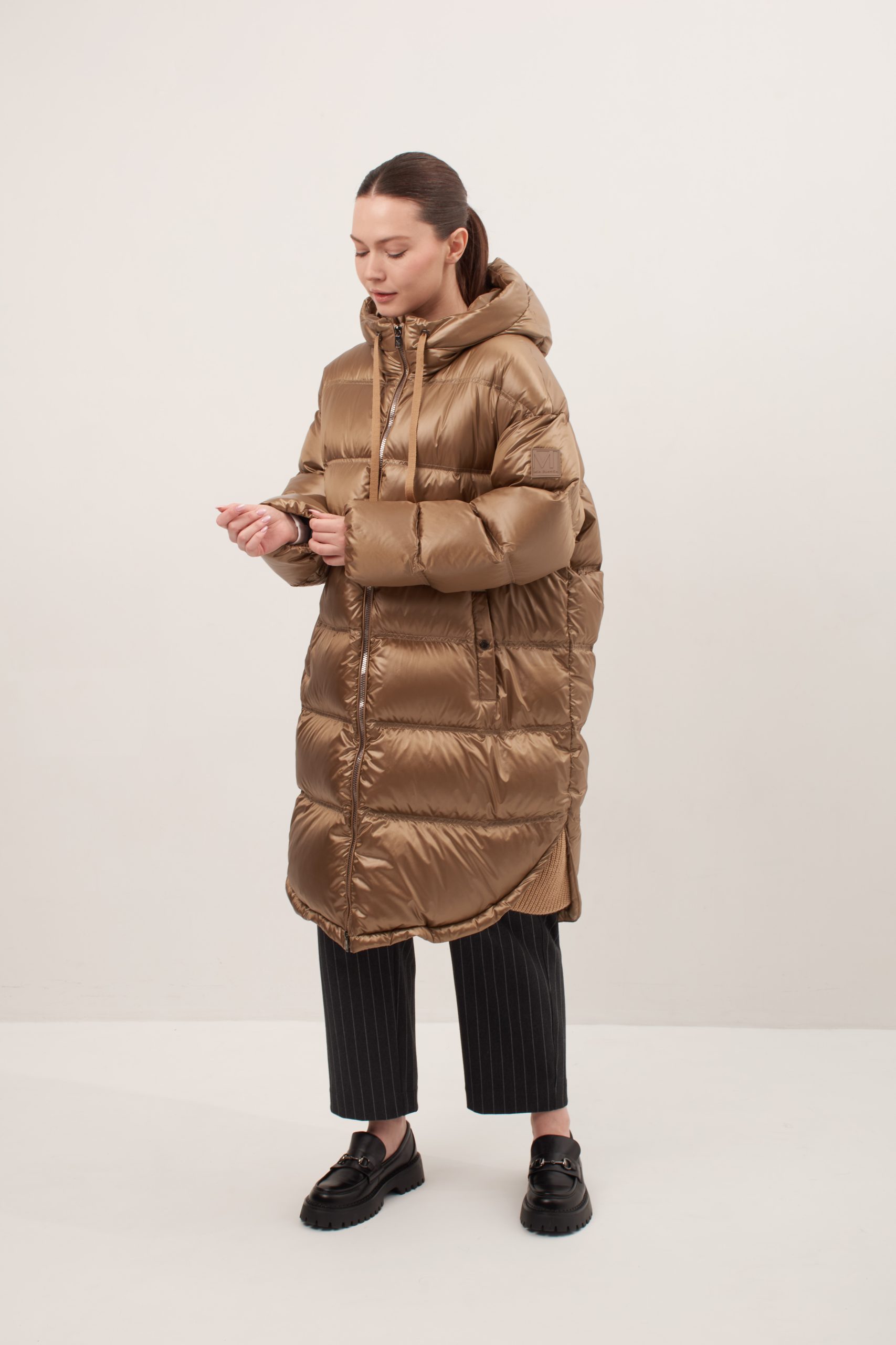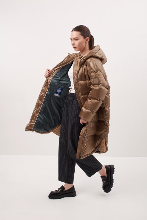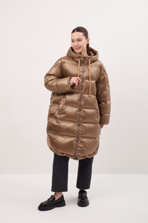 Модель прямого кроя, слегка зауженный к низу, спущенный рукав